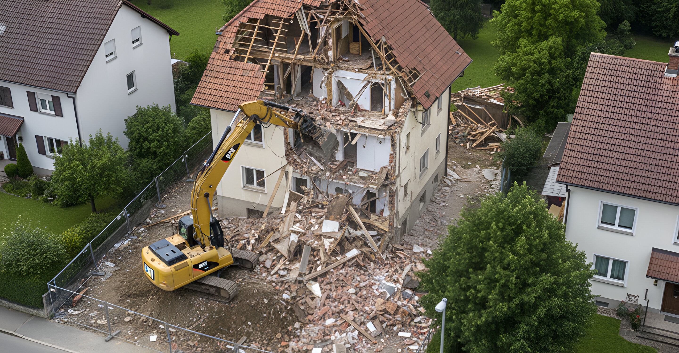 Vollständiger Abbruch eines Wohngebäudes inklusive Materialtrennung und sicherer Baustellenvorbereitung für einen Neubau.